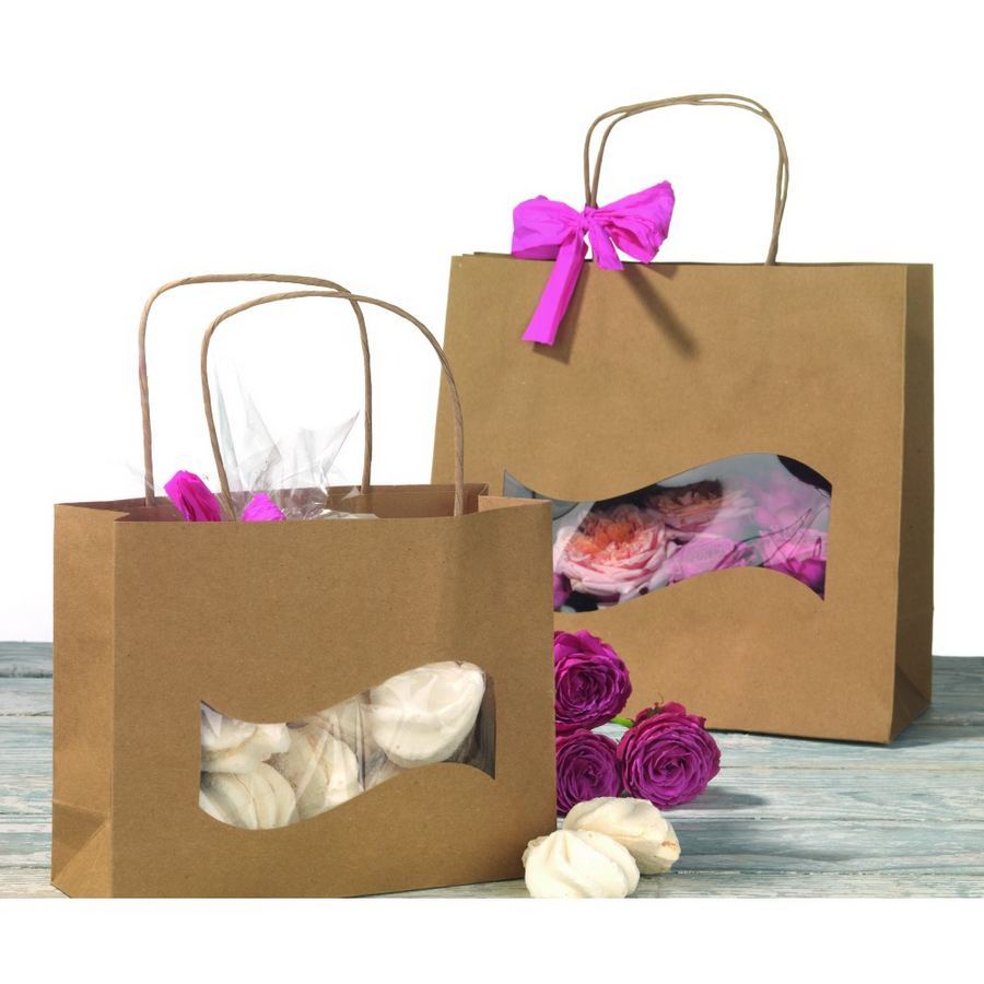 Shopper in carta kraft naturale resistente non meno di 170 gr. e durevole. Questa shopper presenta su un lato, una finestra trasparente a onda e possiede una maniglia in carta ritorta che ne garantisce la robustezza. Le misure indicate si riferiscono in ordine alla larghezza, allo spessore e all’altezza della borsa.