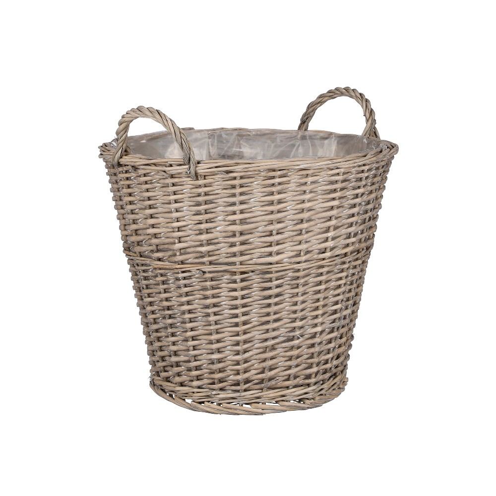 Cesto con manici intrecciato in midollino rivestito internamente con cellophane trasparente. Disponibile in diverse misure.