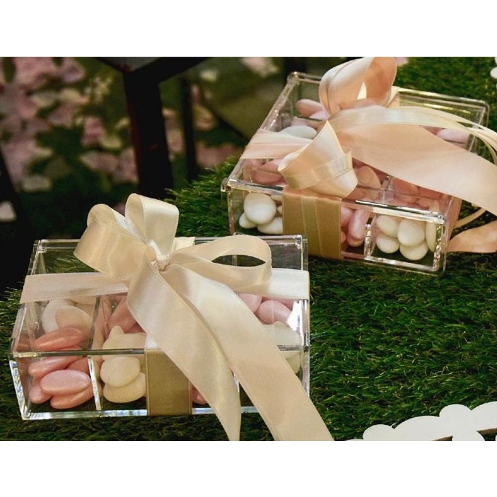 Scatola portaconfetti in plexiglass trasparente certificata per alimenti, ideale per bomboniere e confettate. Completa di coperchio è disponibile nella versione quadrata con 9 scomparti e rettangolare più grande con 24 scomparti.